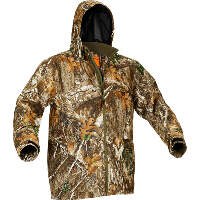 The Heat Echo Raider Jacket features Retain Active technology to block out cold and retain natural heat while still being breathable. This jacket is constructed with rugged, quiet, brushed polyester tricot fabric to remain stealthy during hunts. This jacket is waterproof, windproof, breathable, and lightweight. Includes mesh lining in the main body and polyester tricot in sleeves. The attached 3 piece hood is adjustable with a drawcord. The high collar and inner storm flap help keep rain out during extreme conditions. Includes zippered chest pockets and hand warmer pockets, adjustable wrist cuffs, and adjustable drawcord bottom hem.