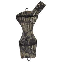 Hunting hip quiver with firm center stave for stability. Fits six carbon or aluminum arrows. Includes web belt and adjustable web strap. Converts to right or left hand, and snaps on and off the belt.