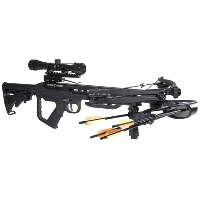 - Package includes: 4 x 32 crossbow scope, 4 aluminum bolts, 6 bolt quiver, cocking rope, safety glasses, and rail lube.